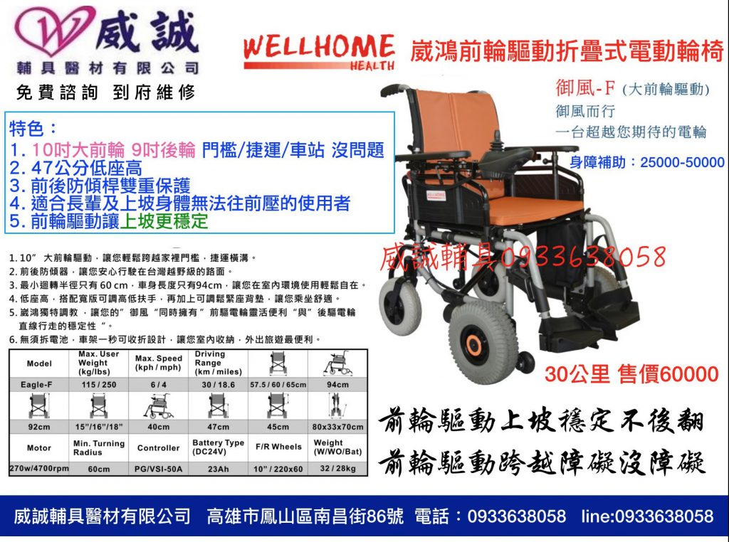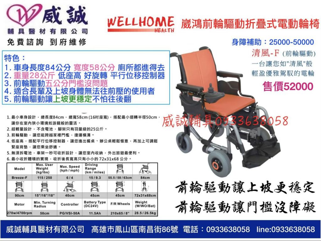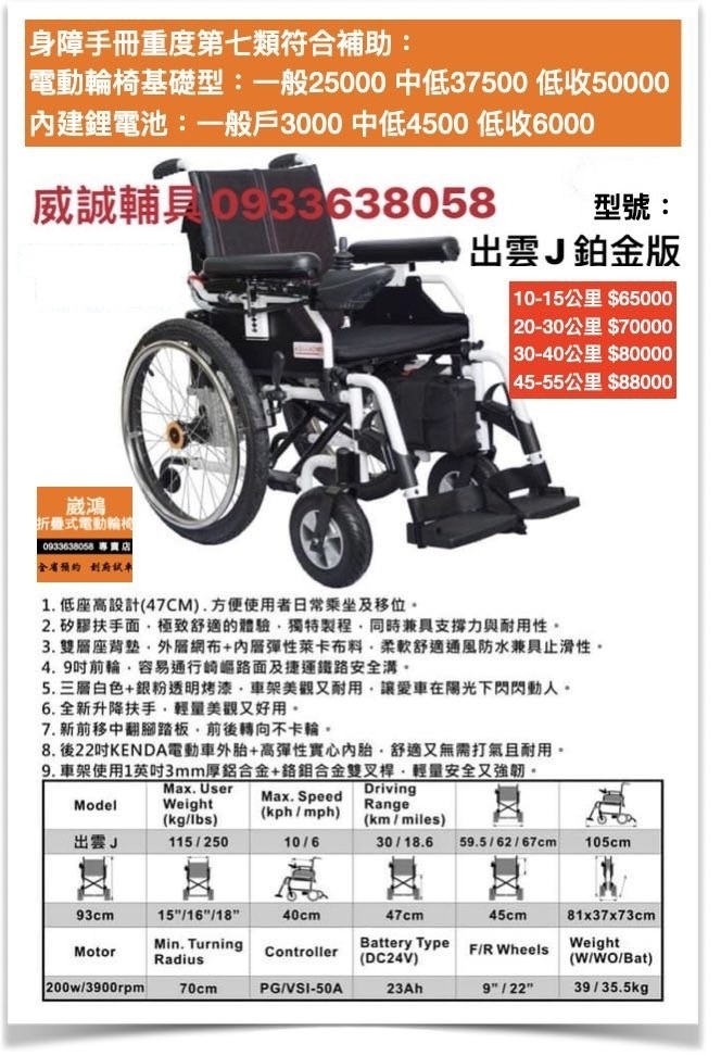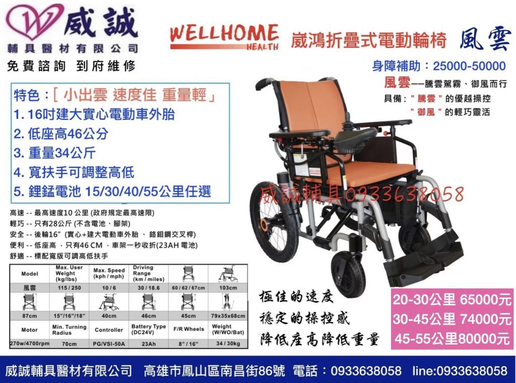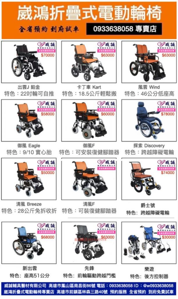 powerwheelchair 銷售第一:出雲J 輪子越大越安全 銷售第二:卡丁車 解決搬運問題 銷售第三:御風 俗又大碗 清風:28公斤輕鬆收納 免拆裝 風雲:低座高 速度快 國民電輪:不能補助的買這台 探索號:跨越7公分門檻 爵士號:跨越7公分門檻 清風F:電動輪椅腳踏車 御風F:電動輪椅腳踏車 先鋒:前輪驅動 御風F:前輪驅動 復健腳踏輪椅 產品DM